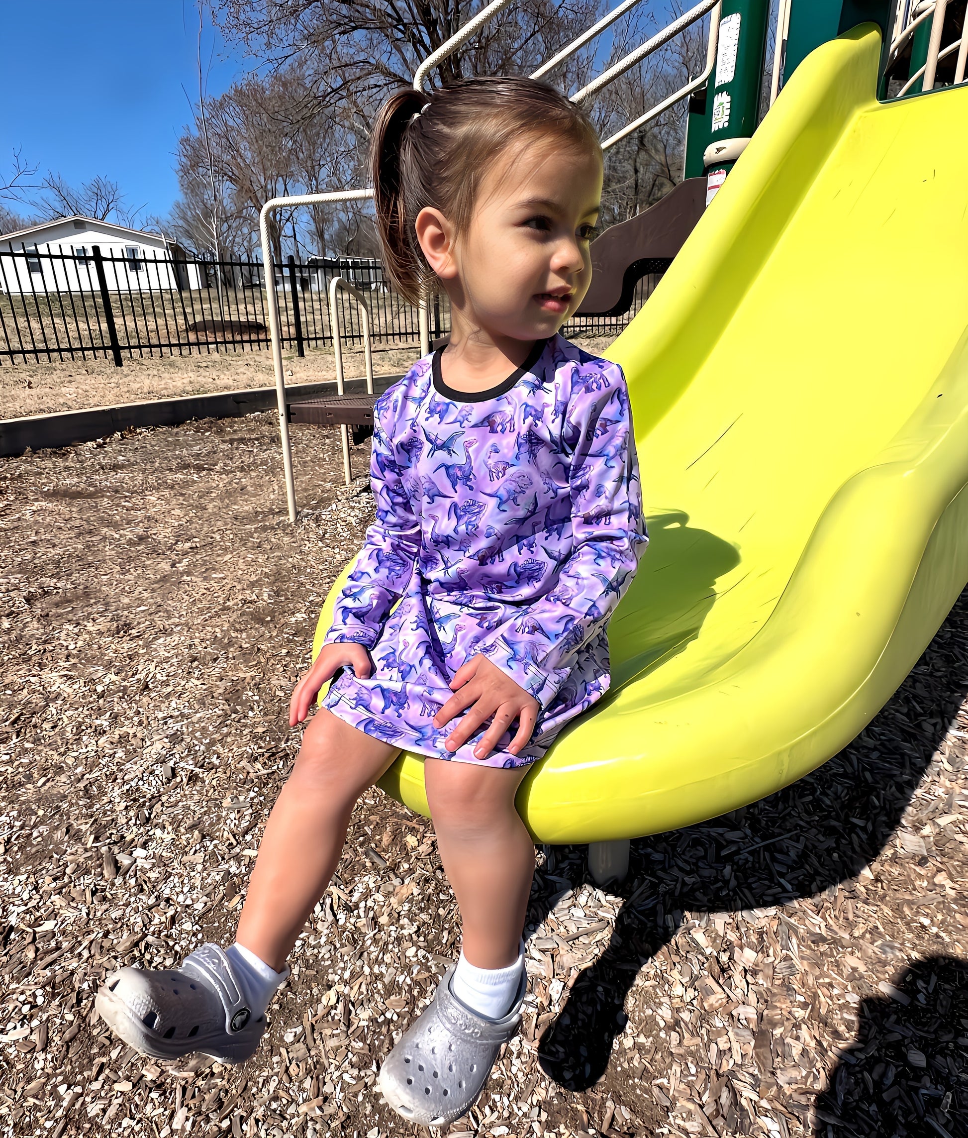 I ordered this long sleeve dinosaur dress for my daughter. This dress is adorable! Purple is her favorite color so this dress was an immediate hit. Plus, the dinosaur print is cute. You don't see a lot of dinosaur dresses around. It fits her true to size. The material is soft on the skin. Overall, the dress seems well constructed and perfect for any young dino fan.