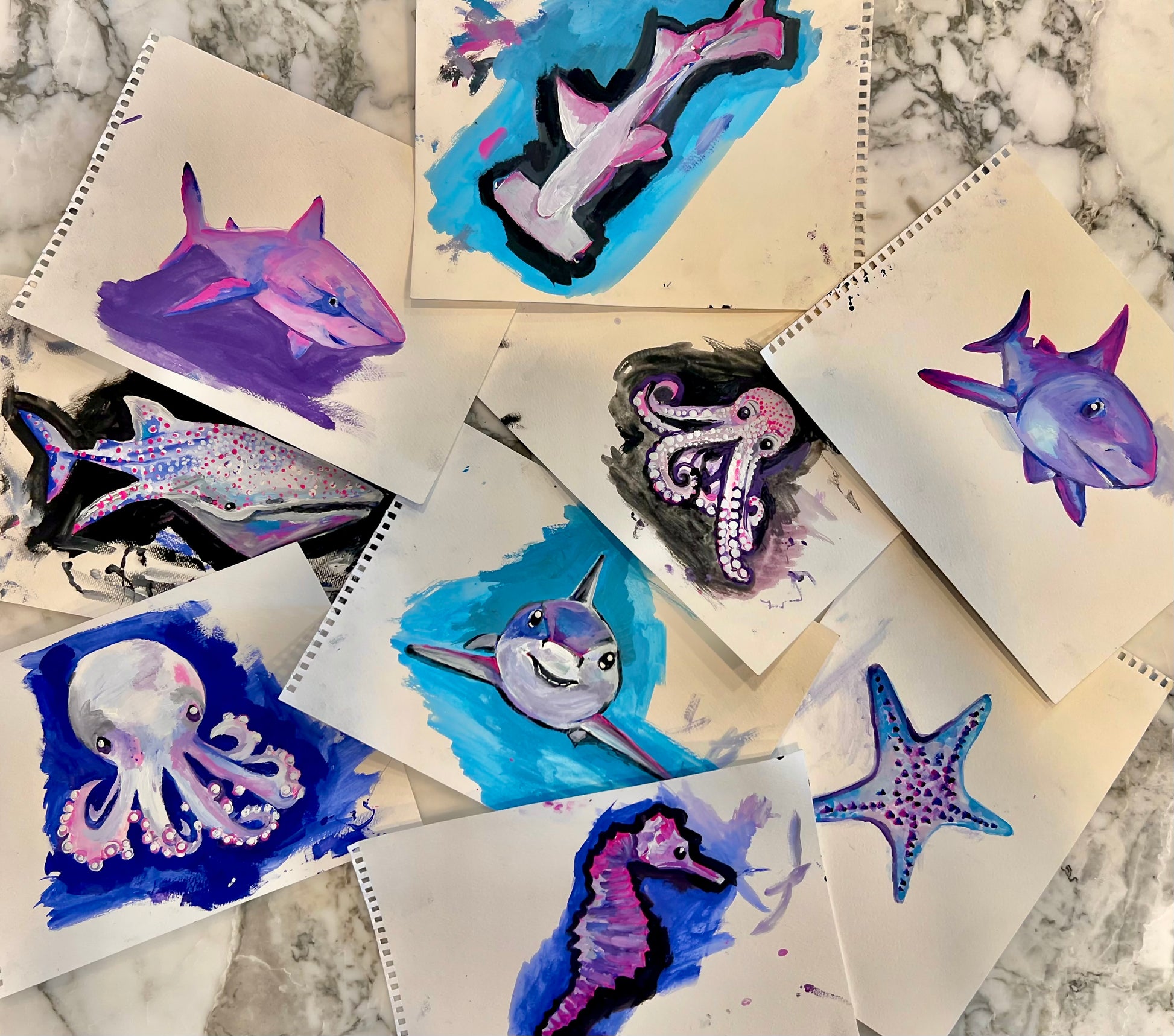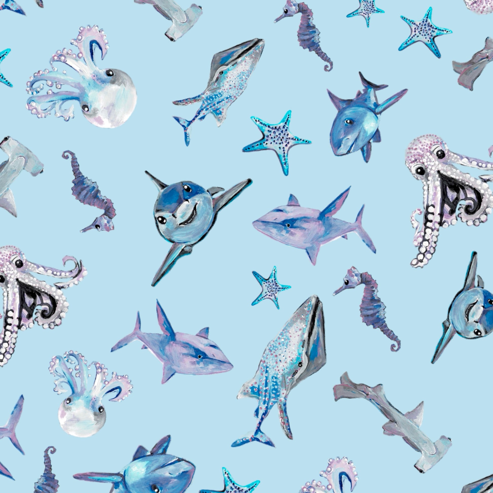 Let your shark-loving kiddo dive into the day with comfort and confidence. This cheerful twirl dress features our original Sparky Shark print — hand-painted watercolor sharks, octopuses, pufferfish, seahorses, and starfish — all swimming across a bright ocean blue.